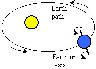 | Let's orient ourselves - pretend you are looking down on the Solar System from above so that the Earth goes counter-clockwise around the Sun. From that viewpoint, the Earth would also rotate counter-clockwise on its own axis. So, since the East rotates toward the Sun first, we see the Sun "rise" in the East. Later, the West will rotate around so the Sun "sets" in the West. |