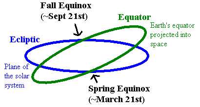 So, we have one giant circle in the sky which is the ecliptic (where the sun/moon/planets) travel, and another giant circle representing the Earth's equator projected up into the sky. Do they cross? Yes, at two times of the year : the Vernal (Spring) Equinox, near March 21st, and the Autumnal (Fall) Equinox, near September 21st (you'll see than in an illustration later on the page).
