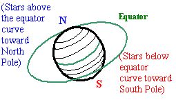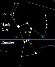 | Is there a constellation that "straddles" the equator? Yes, the winter constellation Orion (the one with the three stars in the belt) overlaps the equator. If you took a long-time exposure picture of Orion, you might be able to see the stars in the upper part curve upwards, and the stars in the lower part curve downwards - I'll try that this winter and post the results here! (Here is a figure from HomePlanet for Orion {I added the stars so we could see it better}. The belt for Orion is just below the equator - with very long time exposures, it might be possible to see the top part of Orion trying to curve to the North, and the bottom trying to curve to the South! |