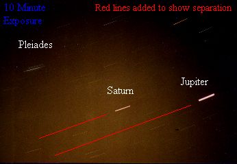 | Planet-trail photo! For example, if we take a time exposure of Saturn and Jupiter - we would see that there is an apparent separation in the sky of their trails. Here is a 10 minute exposure of two planets : Saturn (on the left) and Jupiter (on the right). [Notice the Pleiades - a cluster of stars - on the far left - they form a tight group of trails!] It seems like we need to know more about the Equator and the Ecliptic to understand what is really happening in this photo! Keep reading! |