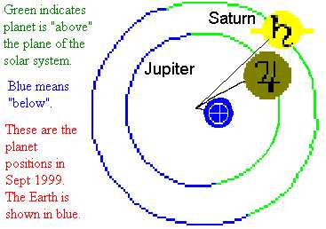 | Where are Jupiter and Saturn (as of 1999)? Here is a plot that shows the positions of Jupiter and Saturn around their orbits (roughly) and shows where the Earth is in its orbit. [Note, this also explains why we see Jupiter to the "West" of Saturn in the sky - Saturn is farther along the orbit than Jupiter - in fact, in the Spring of 1000, since Jupiter is closer than Saturn, and moves faster in the orbit - Jupiter caught up with Saturn, and then passed Saturn, and will be "East" of Saturn for a few years, and then it will "catch up" to Saturn again from the "West". {Jupiter has an orbit period of about 12 years, Saturn has an orbit period of about 30 years.}] Also, notice the lines drawn from "the sun" to the planets - the line for the Earth is almost pointing completely to the right. This illustration was made with HomePlanet - see info in "references" section below. |