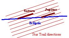 | Let's connect that back to the photo of Jupiter and Saturn! Look back at the planet-trail photo. Notice the red lines (they were added afterwards .. the planets don't leave colored streaks like that - ha!) - they seem to indicate that Saturn and Jupiter are not trailing along the same line. But, this is misleading!!! Saturn and Jupiter are slightly above the ecliptic (we know that from the previous picture) - but, because of the angle between the ecliptic and the equator, it makes the trails for the planets appear to be separated! So any of the planets we try to "trail-photograph" will trail at an angle relative to their actual path through the Solar system. |
