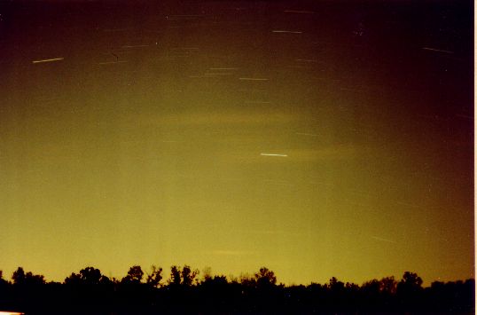 If you have a 35 mm camera and some color film - I highly recommend you taking some "star trails" pictures. You want to find a dark sky and it is better to shoot up toward the sky overhead (since there would be less of the horizon glow that way). I'm still playing around with what speed films work the best : slow films have good resolution, but might not pick up some of the fainter stars, higher speed films pick up the fainter light, but don't have as fine a resolution. I've used 400 and 800 speed film with good results - I'm going to try some 100 speed and see what I get.