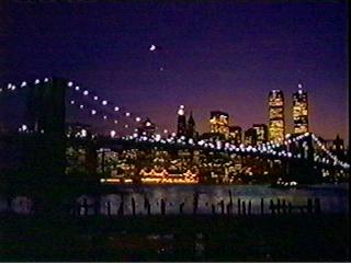 When did they film that scene for Friends?In the episode "The One Where Eddie Moves In" which aired on Feb 22nd, 1996, I noticed that there was a Moon in the night shot, and there was a bright planet near it .. the brightness made me believe it was Venus. Suddenly I realized that I could calculate roughtly when they filmed that scene, based on the locations of the Moon, and Venus (and the viewpoint of the shot). After some struggling with maps, postcards from a trip to NYC, and frantic emails around to my family members, I pinned the picture down to the Brooklyn Bridge .. thus facing South West - this would put the timing of the picture as a little after sunset (there is some debate within my family as to whether we are seeing the glow of NJ, or the sunset - I vote for sunset. The age of the moon (a guess, based on the few pixels that make up the Moon in that image) is about 5-6 days old - that would put it about 4-5 hours after sunset. Applying astronomy calculations to the current configuration, I decided they filmed that footage on or about the 23rd-24th of January in 1996. About a month before it aired - seems reasonable! Added Bonus : Just to show you that television really is an original medium .. take a look at these other two shots from Felicity and from Judging Amy (when a segment of the show was set in NYC). There aren't any moon/Venus sightings - but its the same bridge! |