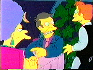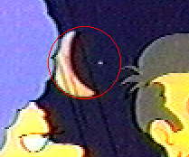 Surely, "The Simpsons" won't make a mistake with the Moon?Yes, they did, and stop calling me Shirley. In one episode (I don't remember exactly which one), we can see that Principal Skinner is having a romantic dinner with Selma (or Patty?) .. and the Moon is shown over their shoulders. (The bottom image is a blowup of the Moon. I added the red line to show the apparent diameter of the Moon.) What's that .. a star is in the "shadowed" portion of the Moon?? Even though the Moon is "dark" there ... a star will not "bleed through"! (You might be tempted to write in and claim it is an airplane ... but it didn't move during the scene!) Bonus info: Once again .. this particular phase of a Moon is a very "old" moon - very close to New Moon .. thus it will appear in the sky in the Morning! Thus, this is a pre-breakfast date? |