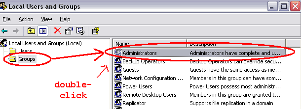 Step 4)Click on the GROUPS folder on the left, and the double-click on the ADMINISTRATORS link on the right side.