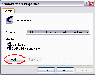 Step 5) At this point .. if you see your name showing up in the Members box ... like CAMPUS\s_schneider (for me) - then stop - you are already listed in the Administrators group! You can just click Cancel and get out of the other dialogs.