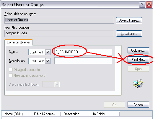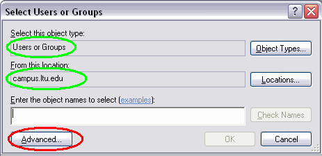 Step 6)Check to make sure that the Users or Groups is the object, and the campus.ltu.edu is the location ... then click the ADVANCED button.