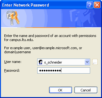 Step 7) At this point, you should see a dialog box asking for you to give your username and password. Type in your regular username, and your regular network password (the one you would use to log into the CAMPUS server (or the LTU4 server). {If you do NOT see this login box - that you probably didn't get this far, because it would mean that you are actually in your regular account, and don't have the administrator rights.}