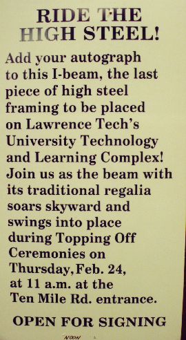 There was a "topping off ceremony" at LTU in the third week of February, as the last beam was raised to the roof of the new building. Not to pass up a photography opportunity - I was there, camera in hand. Here are the results! (Click on the images to see larger versions.)